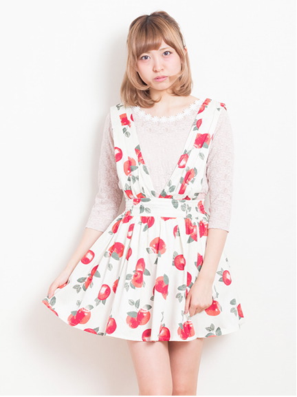 アップル柄のワンピース。同じ柄で、スカートやチュニック