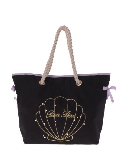 収納力バツグンのシェルデザイントート。パールをあしらい、リボンでガーリーに仕上げています。