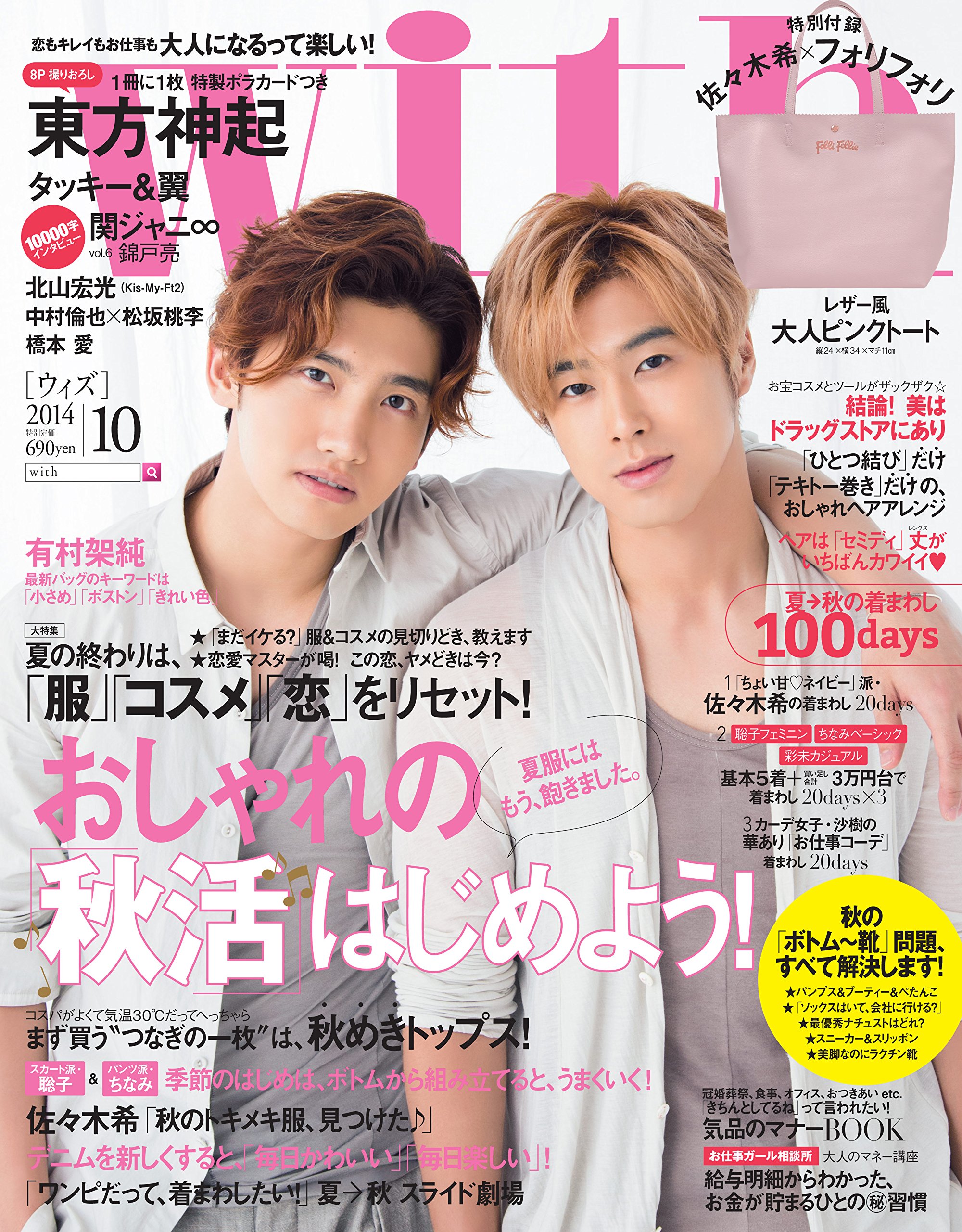 出典:with|YouTubewith(ウィズ) 2014年10月号 ☆価格:定価690円(付録付き)/550円(付録無し) ☆表紙:東方神起 ☆特別付録:佐々木希×フォリフォリ レザー風大人ピンクトート ☆内容:おしゃれの「秋活」はじめよう!/夏の終は「服」「コスメ」「恋」をリセット!/「ちょい甘♡ネイビー派」佐々木希の着回し20days