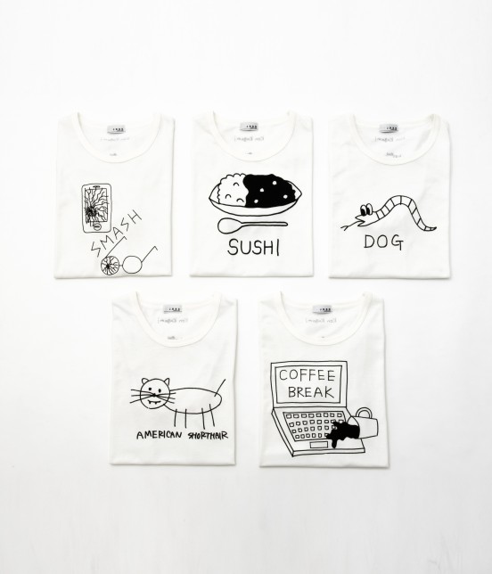 今回、公式通販では、完売していた「SUSHI」と「DOG」プリントを追加予約スタート! ホワイトのTシャツで、デザインは全5種類。ぜひこの機会をお見逃しなく☆