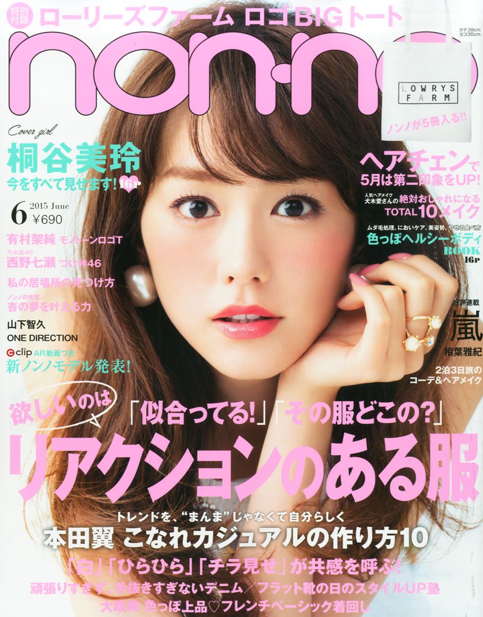 雑誌non-no6月号が発売されました。表紙は桐谷美玲さん、付録はLOWRYS FARM(ローリーズファーム)の「ロゴBIGトート」。