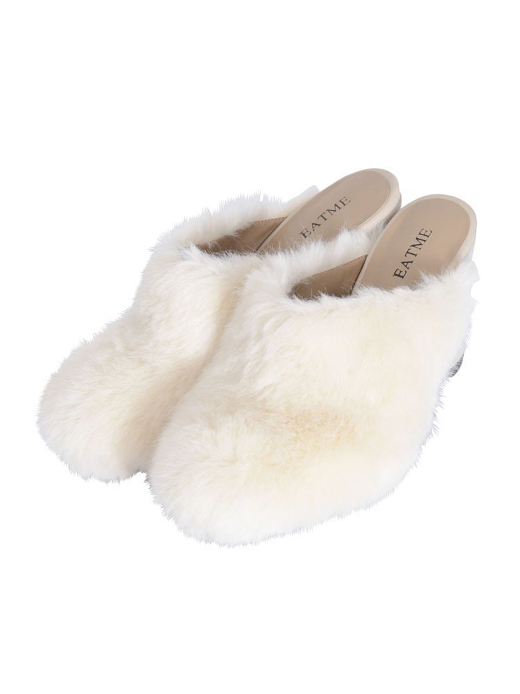 【EATME フェイクファーサボ】 ムートンブーツのように可愛らしく、ヒールサンダルのように美脚に見せてくれるシューズ。つま先までしっかり覆って冷え防止。素足でもタイツでも履けるファーシューズになっています。ロング丈のボトムスと相性◎!