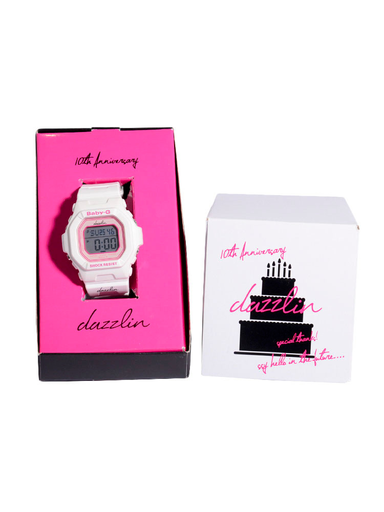 ホワイトのキュートなBaby-Gをベースに、文字盤にdazzlinのロゴが入ったデザインがとってもキュートですね!しかも、腕時計が入っているケースもオリジナル仕様になっていますよ。