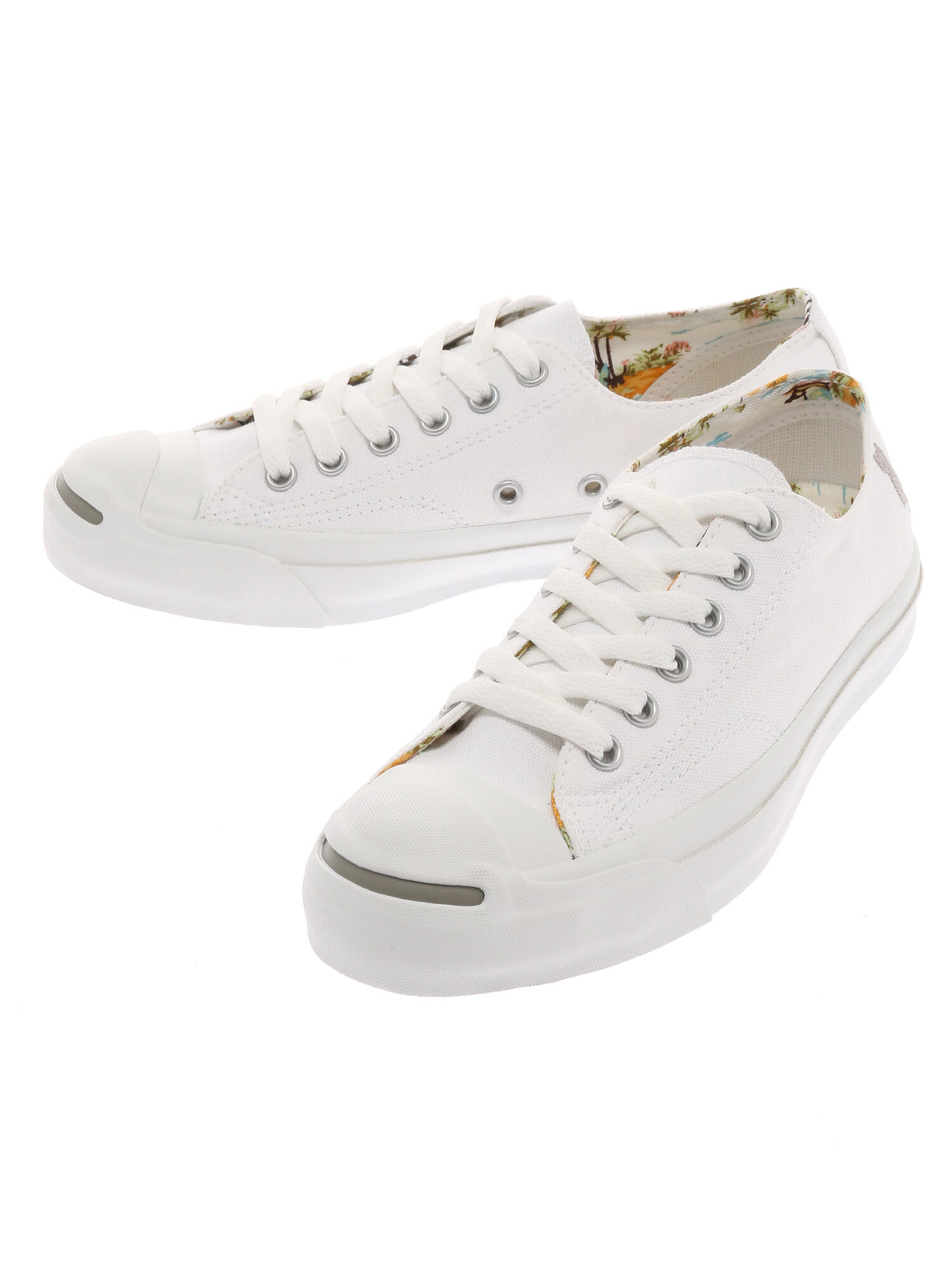 また、CM中に宮崎あおいさんが履いているシューズは、コンバースとearthがコラボした「【converse×earth】JACK PURCELLスニーカー」。シンプルなコンバーススニーカーですが、かかと部分に花柄のプリントがデザインされていて、ワンポイントアクセントになっているのが◎。