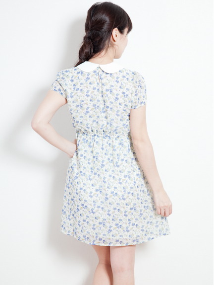 アリスのシルエットがさりげなく入った花柄ワンピース。ウエストはゴムで、綺麗にフィット!丸襟&ギャザーが甘めスタイルに♡